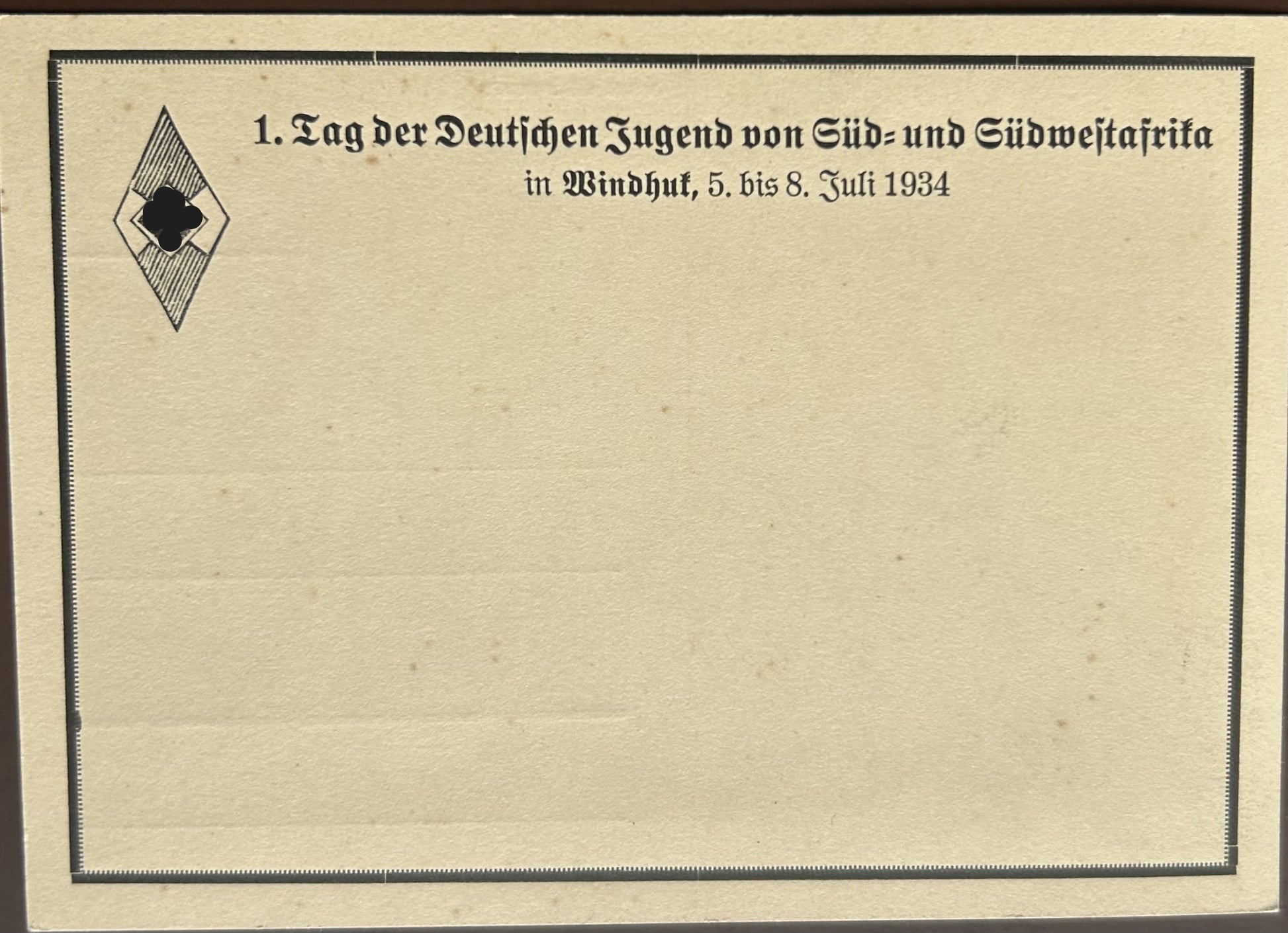 SWA - Der Reiter von Südwest - 1st Day of the German Youth of South and Southwest Africa in Windhoek, 5 to 8 July 1934. Badge on back covered by vendor.