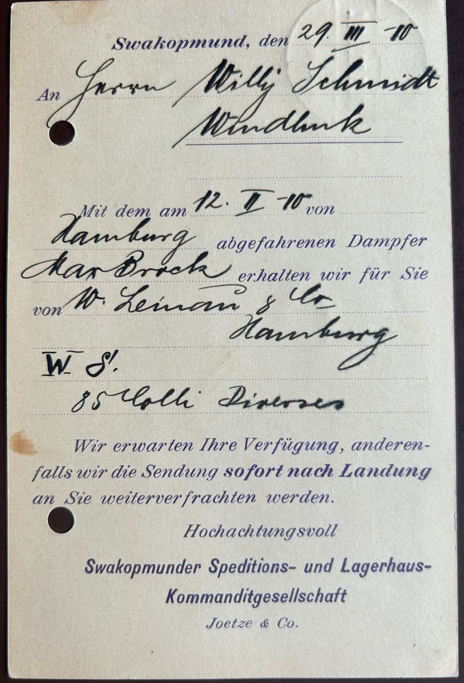 DSWA - Mr Willy Schmidt, Windhoek - 29 March 1910 - Swakopmund Speditions - und Lagerhaus Kommanditgesellschaft, stamped in Swakopmund on 31 March 1910 -using a 5-Pfennig stamp of Deutsch Südwest Afrika. Perforated.