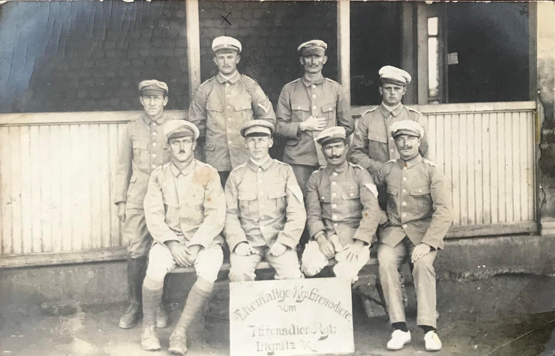 Deutsche Reich - Postkarte - posierende Gruppe von deutschen Gefangenen aus dem Lignitz -Gefangenenlager 1916