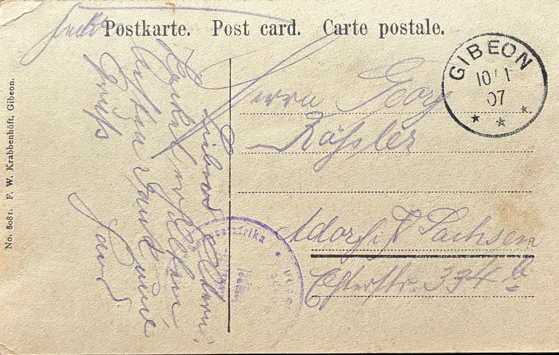 DSWA - Hottentotten Werft - Gibeon - F.W.Krabbenhöft Sammlung, Nr.8081, beschriebene Postkarte 10.Januar 1907, mit seltendem Soldatenstempel
