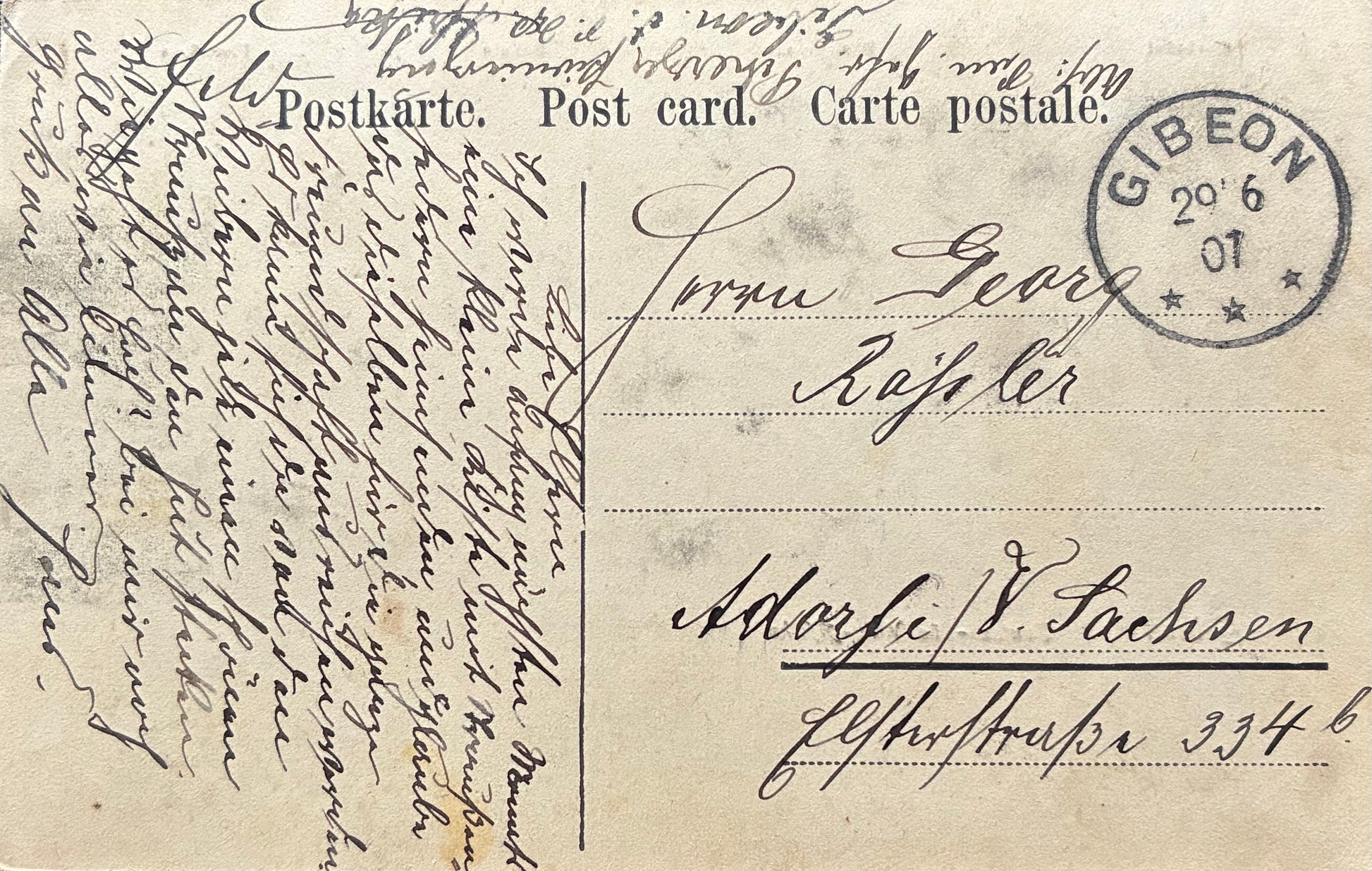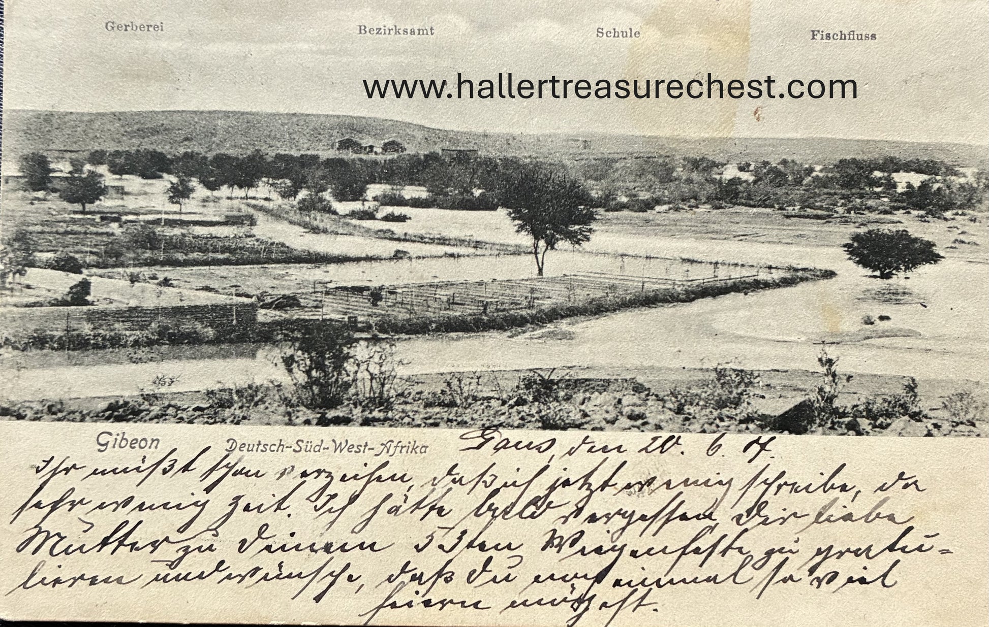 DSW Afrique Vue sur Gibeon - tannerie, administration du district, école, rivière Fish. Carte postale annotée datée du 29 juin 1907.