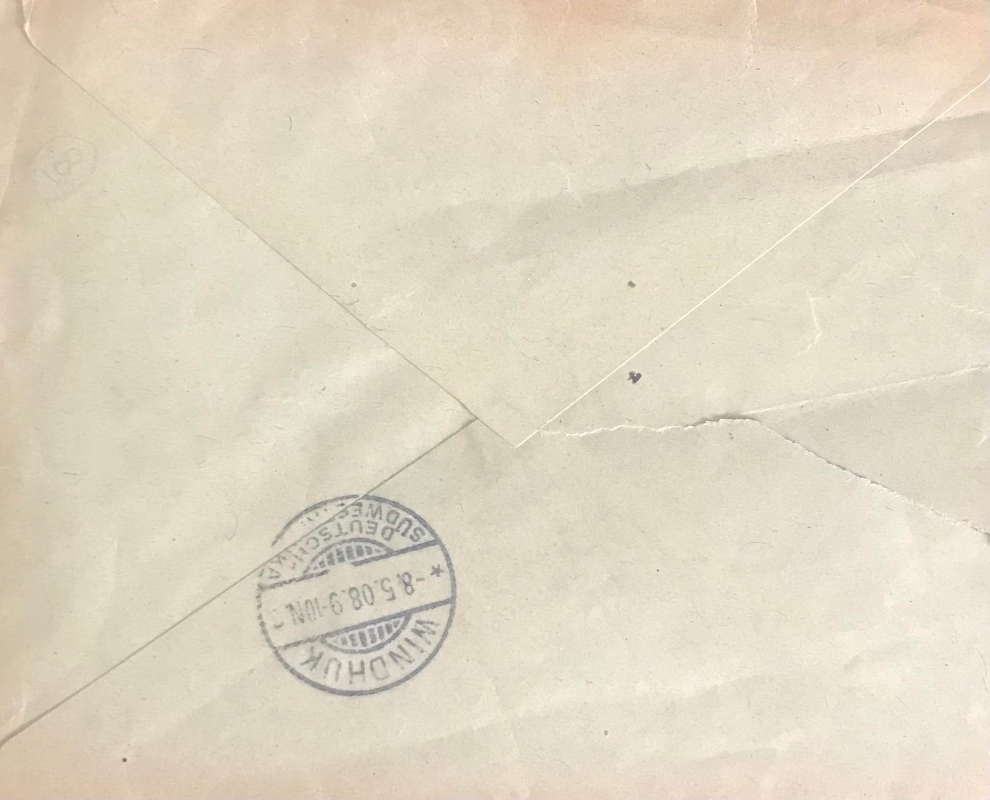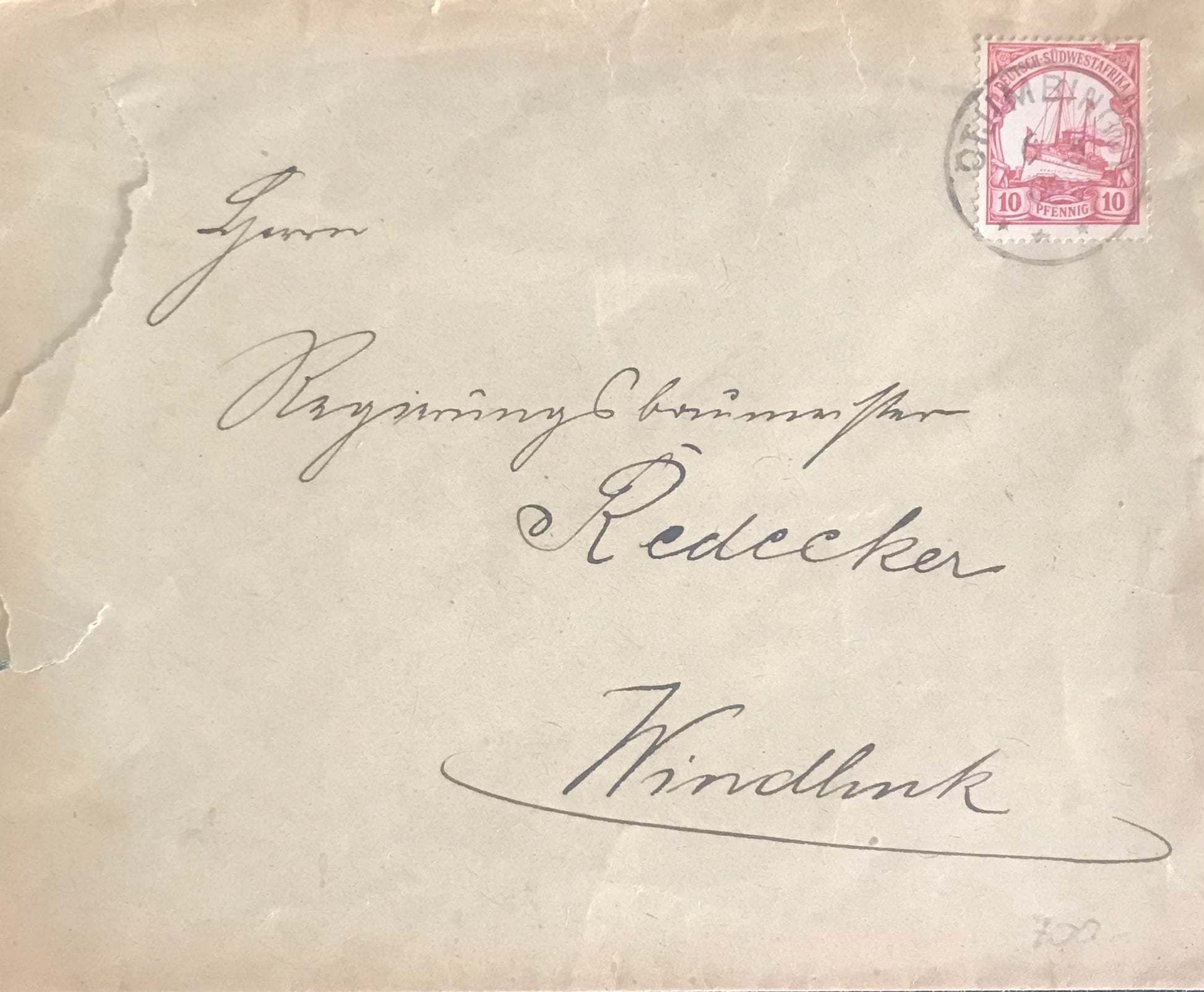 Envelope: To Regierungsbaumeister Redecker - with DSWA 10 Pfennig stamp - postmarked in Otjimbingwe, DSWA 6 May 1908, received in Windhoek on 8 May 1908. Gottlieb Redecker was the architect of the Christuskirche, Windhoek, which was officially inaugurated 16 October 1910.